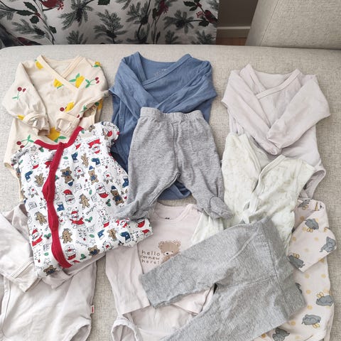 Hyväkuntoinen vauvan vaatepaketti. Vaatteet kokoa 50-56 ja ovat pääsääntöisesti uutena meille ostettuja, yhden lapsen käytöstä. Kaupanpäälle kuvissa näkyvä konttauskypärä ja käyttämätön nallehaalari, joka jäi kuvista pois.