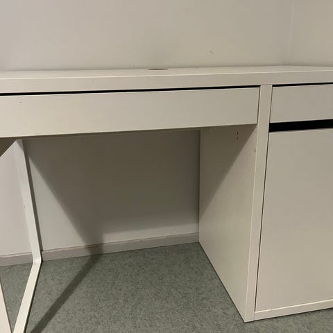 Ylimääräiseksi jäänyt työpöytä joutaa uudelle käyttäjälle. Pöytälevy on päältä mustaksi maalattua liimalevyä ja päällä lasilevy joka lähtee irti. Metallijalat. Lasilevystä haljennut pieni pala joka näkyy kuvassa. Säilytetty lämpimässä varastossa.