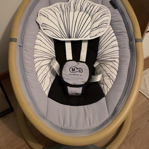Kinderkraft sähköinen babysitteri vauvoille. Babysitterissä on vaaleanpunainen istuinosa ja harmaa metallirunko. Istuimessa on turvavaljaat ja yläpuolella leluja roikkuva kaari. Jalustassa on ohjauspaneeli, josta voi säätää keinuntatoimintoa ja ääniä. Mukana tulee virtajohto. Soveltuu pienille lapsille lepo- ja leikkihetkiin kotikäytössä.