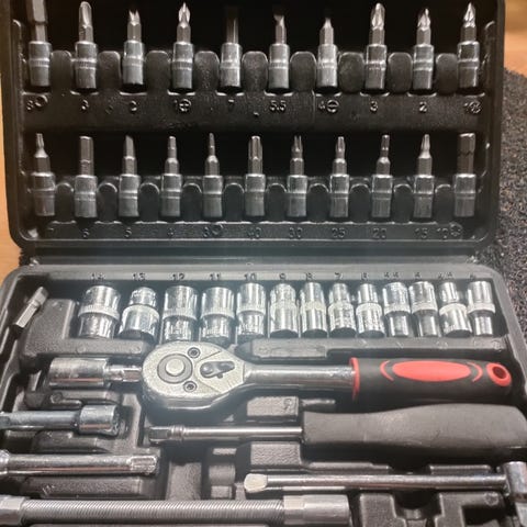 Käsityökalulajitelma, johon kuuluu räikkäväännin useilla erikokoisilla hylsyillä, pihdit sekä useita kiinto- ja jakoavaimia. Osa työkaluista on ruostuneita ja kuluneita. Soveltuu esimerkiksi perushuoltoihin, korjauksiin tai varaosiksi työkalupakkiin tai autotalliin.