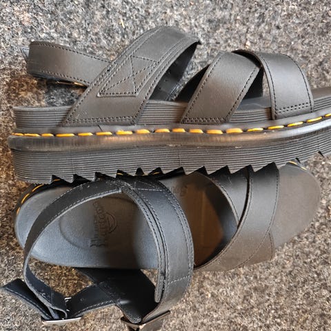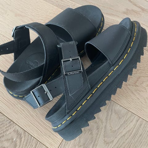 Dr. Martens sandaalit, koko 38. Mustat nahkasandaalit paksulla pohjalla ja Dr. Martensille tyypillisellä keltaisella tikkauksella. Uudenveroiset. Hinta 110 € + toimituskulut. Oma laatikko hävinnyt.