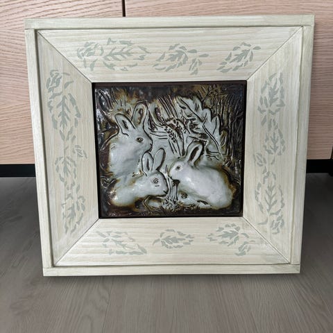 Pentik Studio Fauna seinätaulu, design Henrik Allert. Taulun keskiosassa on kohokuvioitu keramiikkalaatta, jossa on jänisaiheinen kuva. Hienot sävyt.Laatta on upotettu leveään, vaaleaan puukehykseen.
