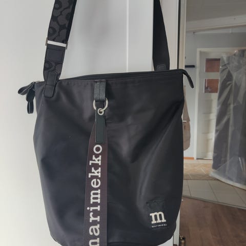 Marimekko olkalaukku, musta, kangas. Useita vetoketjutaskuja, tilava.