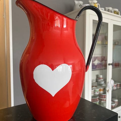 Erittäin hyväkuntoinen, nostalgisella maaseutumaisemalla koristeltu pieni emalikannu, samaa Pyrodur-sarjaa kuin myynnissä oleva enalimukini.