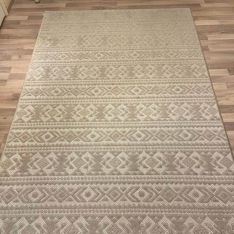 Matossa on vaalean beigen sävyinen pinta, jossa on erilaisia kudottuja ja nukkapintaisia raitoja.
