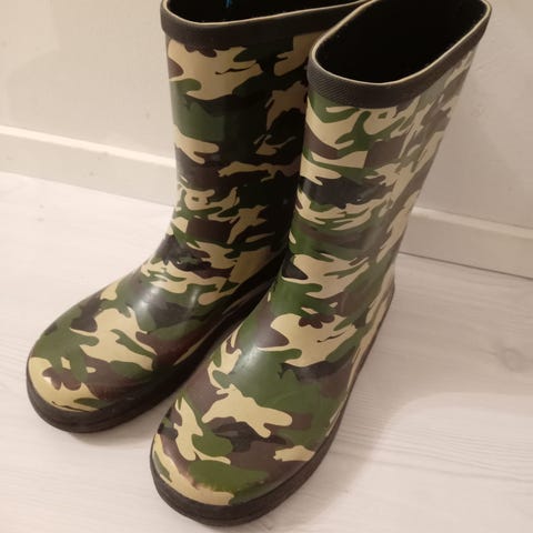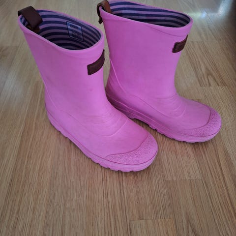 Lasten kumisaappaat, koko 34. Väri pinkki. Materiaalina kumimainen, vettä hylkivä muovi. Korkea varsi ja karkea pohjakuvio.