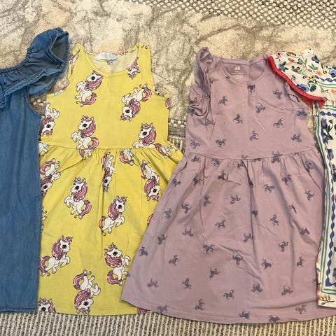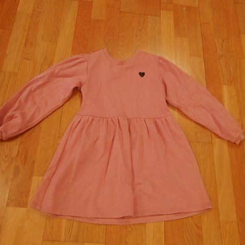 Tyttöjen mekko, koko 116/122. Mekko on musta ja siinä on kauttaaltaan kultainen lintukuosi.