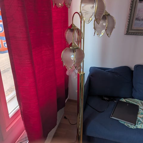 Myydään kunnossa oleva kissankello lattiavalaisin. Ainut vika on että kaksi lasia puuttuu siksi edullisempi hinta.