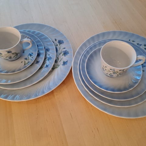 Sinikukkainen astiasto joka sisältää seuraavat osat: