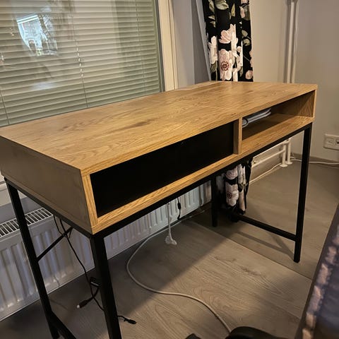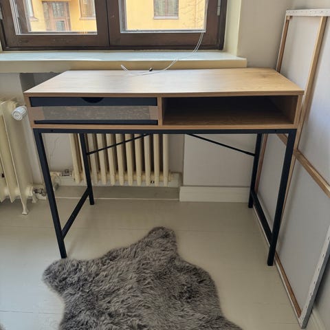 Miltei täydellisessä kunnossa oleva työpöytä muuton tieltä uuteen kotiin. Pöydän oikealla puolella syvä hylly, vasemmalla vetolaatikko. Väri lämmin tammi ja musta. Saa osiin kuljetusta varten.