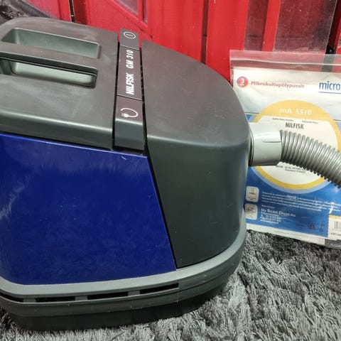 Nilfisk Type GSD pölynimuri, teho 700 W. Metallirunkoinen laite, jossa yläosassa kantokahva ja letkuliitäntä. Toimii 220 V jännitteellä. Soveltuu kodin tai työtilan yleiseen imurointiin kovilta lattioilta ja matoilta. Mukana kuvissa näkyvät perusosat ja mattotamppari.