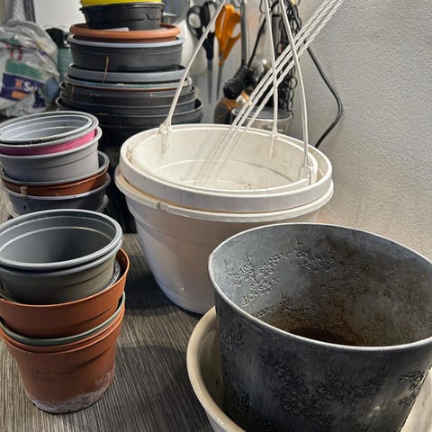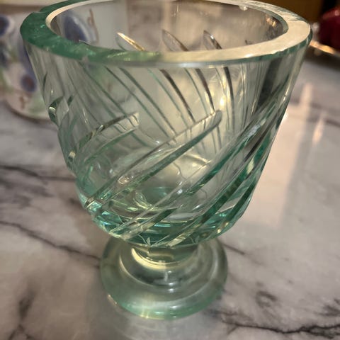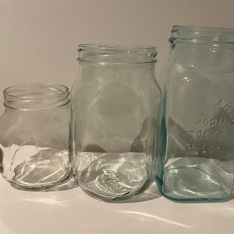 3 + 1 kpl koristepulloja. Vihertävä kissapullo, sininen kartiopullo ja oranssipullo. Kuvassa oleva Remy Martin XO ruusukepullo jo laitettu kierrätykseen.