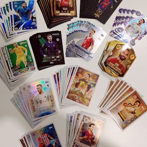 Topps Match Attax jalkapallokortit sekapaketti. Korteissa on useita eri seurojen pelaajia ja seuralogoja, muun muassa Mestarien liigan ja Eurooppa-liigan joukkueista. Pakettiin kuuluu erilaisia erikoiskortteja, kuten esimerkiksi Entertainers-, Vintage Vibes- ja seuralogokortteja.