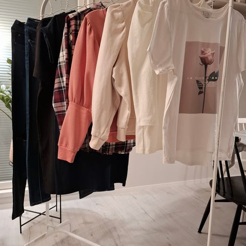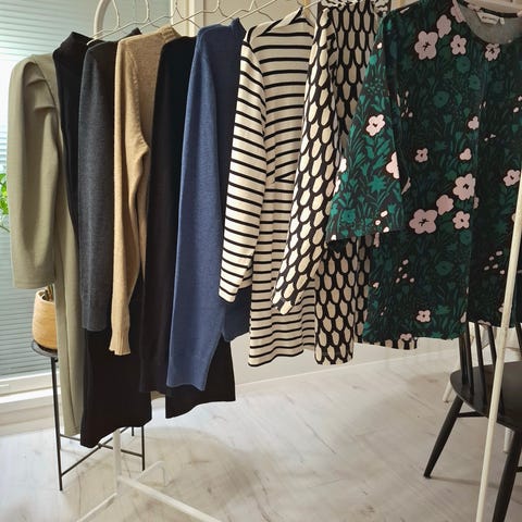 Myydään naisten vaatepaketti koossa M. Kaikkia vaatteita on käytetty, toisia enemmän ja toisia vähemmän, ovat kuitenkin ehjiä ja siistejä. Paketti sisältää pitkän neuletakin, 3 neulepaitaa, 2 trikoopaitaa ja yhden ulkoilupaidan.