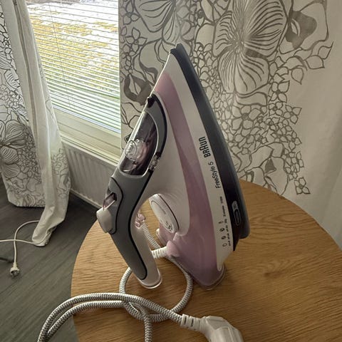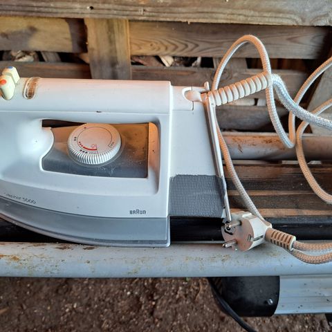 Braun silitysrauta. Väri valkoinen tummalla pohjalla. Laitteessa on mekaaninen lämpötilansäädin, jossa merkitty eri materiaalit (esim. synteettiset kuidut, silkki, villa, puuvilla, pellava). Kahva on suljettu ja virtajohto lähtee laitteen takaa. Sopii erilaisten vaatteiden ja kodintekstiilien silitykseen materiaalimerkintöjen mukaan.