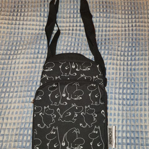 Musta laukku, jossa hauska valkoinen hahmo printti. Materiaali jämäkkää puuvillamaista kangasta. Mitat enimmillään noin 16 x 18 cm. Syvyys noin 5 cm. Hihnan pituutta voi säätää. Kunto uutta vastaava.
