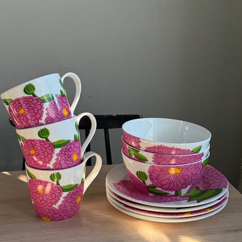 Iittala x Marimekko Primavera astiasto. 1x lautanen, 1x kulho ja 1x muki. Käyttämättömät! Lautasessa pieni jälki vihreän lehden kohdalla.