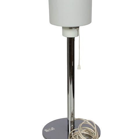 Tyylikäs pöytävalaisin, jossa on valkoinen, alaspäin levenevä jalka ja krominvärinen metallinen kaulaosa. Kermanvärisessä kankaisessa varjostimessa on havaittavissa käytön jälkiä ja pieniä tummia tahroja. Valaisimessa on valkoinen virtajohto ja perinteinen europistoke.Varjostimessa on nähtävissä useita tahroja ja jälkiä.Väri: valkoinen, kromi, beigeMateriaali: keramiikka, metalli, kangasMitat: Korkeus: 56 cm Leveys: 29 cmLampun kanta: E27, 60 Wmaadoittamaton johtotuoe on tarkistettu