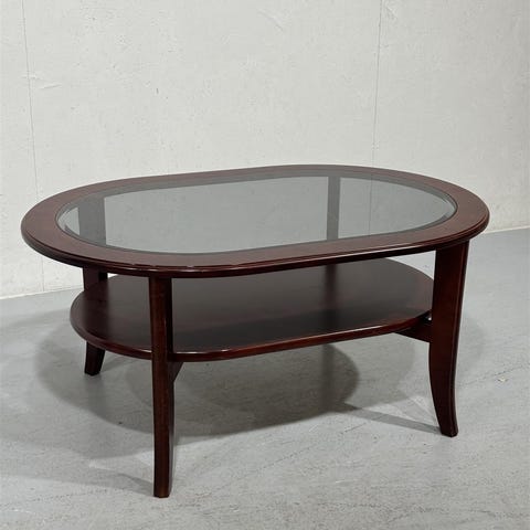Pöydässä on havaittavissa pieni kolhu lasinkulmassa, mutta puu hyvässä kunnossa