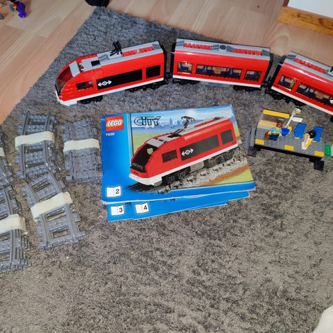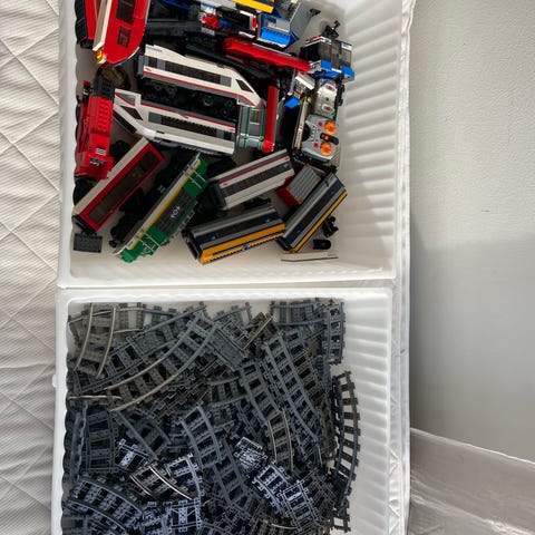 Hyvä kuntoisia Lego city junaradan paloja sekä sähköveturin moottori ja kauko-ohjain. Lisäksi vaunun kiskopyöriä ja alustan osia.
