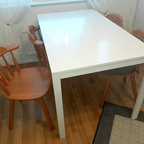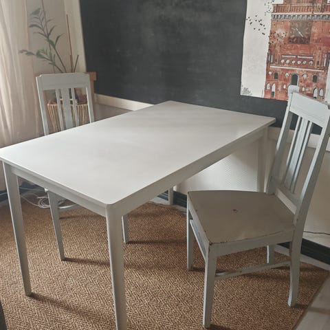 Pöytä ja neljä tuolia maalattu siniseksi, kevytrakenteinen, pöydän jalat irtoavat. Itsemaalattu melko kevyesti.