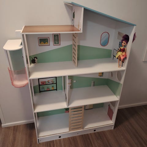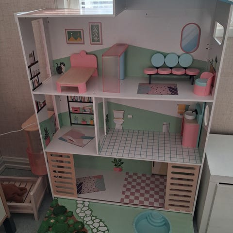 Nukketalo, jossa on useita kerroksia ja huoneita, kuten keittiö, kylpyhuone, olohuone ja makuutiloja. Talossa on valmiiksi maalatut seinät ja lattiat sekä erilaisia kiinteitä ja irrotettavia kalusteita, kuten wc, kylpyamme, pöytiä, tuoleja ja säilytyskalusteita. Sopii leikkeihin nukeille ja barbeille sisäleikkeihin. Korkeus 130cm. Vain nouto.
