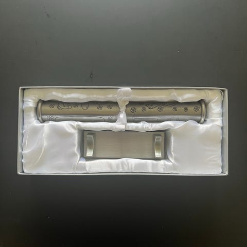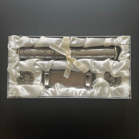 Kastelahjarasia, kastevesipullo puuttuu, mutta tässä voi säilyttää myös muita tärkeitä lahjoja, esim koruja. Kaiverruspaikat nimelle, syntymäajalle, pituudelle ja painolle.