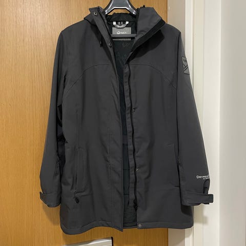 Takissa on DrymaxX-kalvo, joka on suunniteltu suojaamaan ulkopuoliselta kosteudelta ja tuulelta sekä läpäisemään kehon kosteutta. Takissa on kiinteä huppu, vetoketjukiinnitys. Mitat kai-kai 50 cm ja olka-helma niin 65 cm. Koko 38-40. Sisäpuolella on verkkovuori.