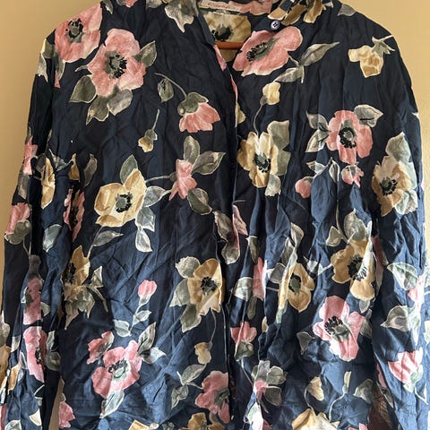 Kuvioitu pitkähihainen silkkikauluspaita. Koko 35, kainalo-kainalo 47 cm ja pituus 75 cm. Vastaa mielestäni kokoja S/M.