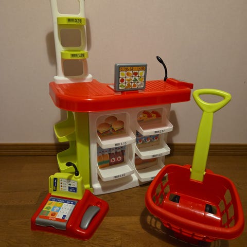 Myydään hyväkuntoinen kauppaleikki, toimiva laskukone ja kassassa rahaa