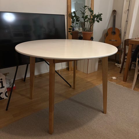 Myydään pyöreä ruokapöytä. halkaisija 110cm. Kannessa pieniä käytön jälkiä. Kansi irrotettu jalasta. En varaa enään mitään Tori.fi:ssä.
