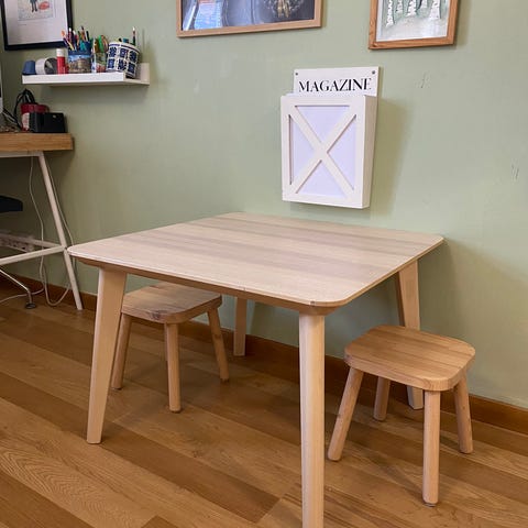 Neliön mallinen isku koivu sohvapöytä tai lastenpöytä. Mitat ovat pituus ja leveys 50cm.