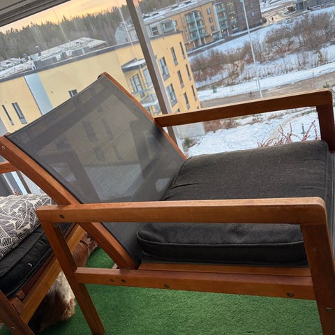 Puutuolit ulkokäyttöön käsinojilla. Tuoli on valmistettu puusta ja siinä on sälerakenne istuimessa ja selkänojassa. Sopii parvekkeelle, terassille tai muuhun ulkotilaan. Tuoli on taitettava, mikä helpottaa säilytystä ja siirtelyä.Kuvassa vielä ennen pesua.Tuusula.Hyrylä.