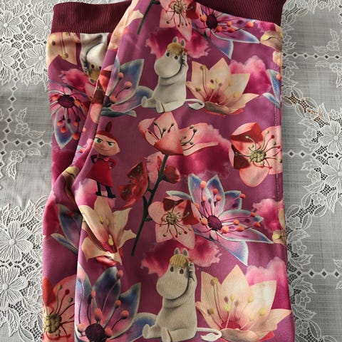 Muumi-verkkapuku kokoa 122. Vastaa kokoaan. Takki siistissä kunnossa. Housuissa polvissa tummentumaa, ei kulumaa. Toisessa lahkeessa pieni kipinän aiheuttama reikä. Peppu siisti.