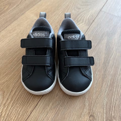 Adidas lasten tarralenkkarit koko 22. Kengät ovat mustat valkoisilla Adidas-raidoilla ja vaalealla kumipohjalla. Sulkeminen kahdella tarranauhalla, jotka helpottavat pukemista ja riisumista. Päällinen on tekstiiliä ja synteettistä materiaalia, sisäosa pehmustettu mukavuuden lisäämiseksi.