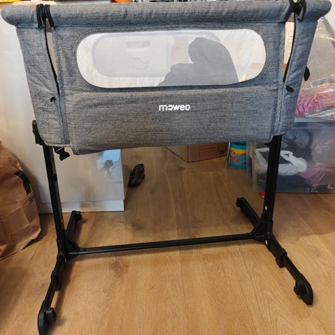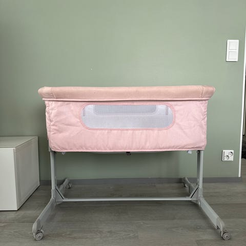 Sivuvaunusänky vauvalle. Kiinnitettävissä aikuisen sänkyyn hihnoilla, jotka mukana. Pehmeät yläreunat ja sivuissa verkkokangas. Patjansuojus juuri pesty.