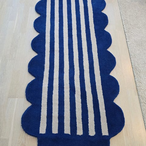 Käsinkudottu villalankamatto, 100% villaa. Matossa on lyhyt nukka ja sileä pinta, joka tuntuu miellyttävältä jalan alla. Sopii esimerkiksi olohuoneeseen tai ruokailutilaan mutta on myös ihanteellinen lastenhuoneen matto. Uuden vastaavan maton hinta n. 600 euroa.