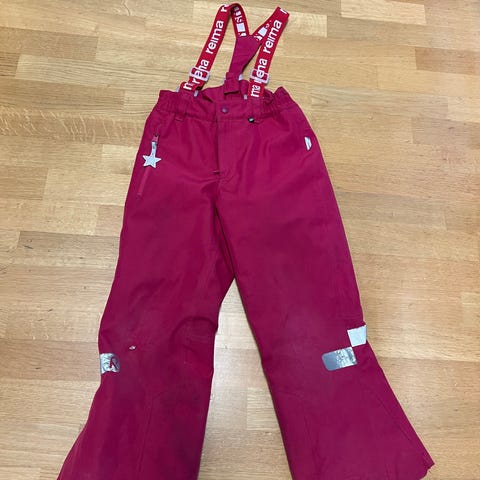 Kirkkaan punaiset ReimaTec Proxima toppahousut kokoa 122cm. Peppu ja polvet ehjät ja siistit, hieman polvissa pehmentymää, joka näkyy kuvassa.