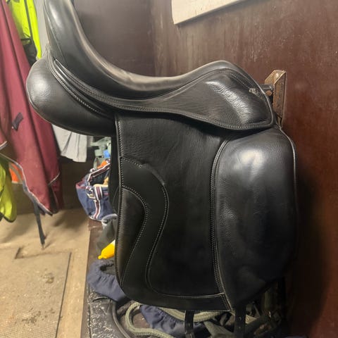 Erittäin hyvässä käytetyssä kunnossa oleva Kingsley D1 koulusatula. Ostettu käytettynä 9/25 Just Dressagelta runkotarkastettuna, jonka jälkeen jäikin kovin vähälle käytölle. Suorahkoon selkään.