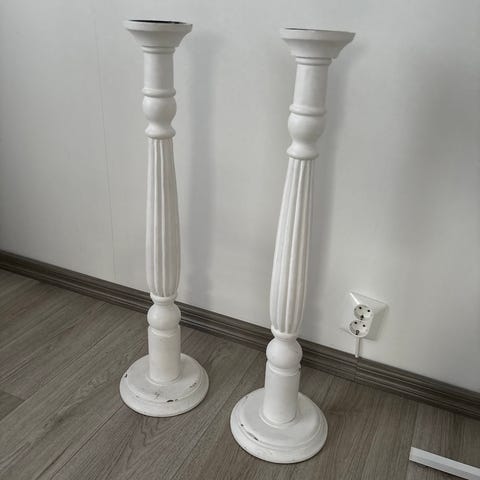 Kynttilänjalka. Valkoinen, jalallinen malli, jossa pyöreä lautanen kynttilälle. Sopii esimerkiksi pöydälle tai tasolle koriste- ja tunnelmavalaistukseen. Materiaali maalattua puuta. Hinta 20€. Vain käteinen.