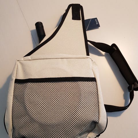 Käyttämätön olalla kannettava picnic laukku 4 hengelle. Myös kylmäosasto, missä 2 pullotaskua ja 2 vetoketjutaskua Lautaset 23 cm, aterimet, viinilasit, servietit, pöytäliina, pullonavaaja, leikkuulauta, leikkuuveitsi sekä muovitettu huopa 150 cm.