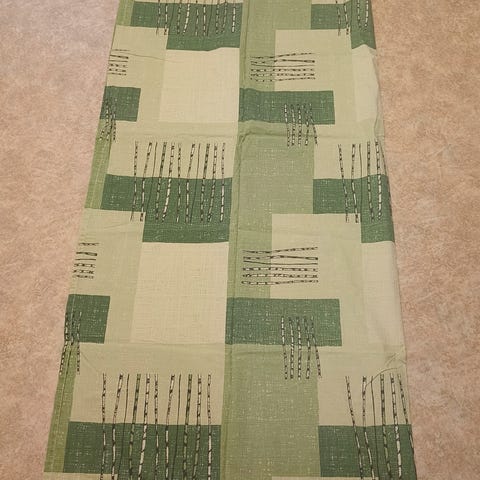Kappoja on 2 kpl. Toisen leveys rypytettynä on 376 cm 35 € ja toinen 235 cm ja hinta 25 € Kapat ovat 30 cm korkuiset.