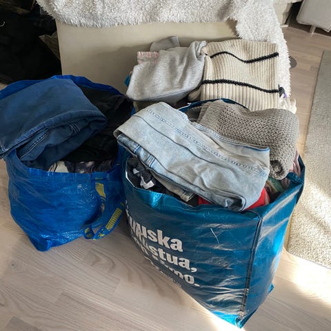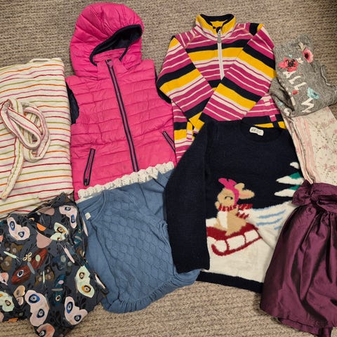 Sekalainen erä tyttöjen vaatteita n.136-146, enimmäkseen 140cm. Voi olla joitakin vähän pienempiä ja isoimmat n.150cm. kenkiä, koko 34-36. Kuvissa näkyy useita erilaisia yläosia, kuten huppareita ja puseroita, sekä housuja. Useita yöpukuja ja aamutakki. Housut enimmäkseen leveälahkeisia. Nike, Zara, H&M jne. Hajusteeton tai mietotuoksuinen pesuaine.
