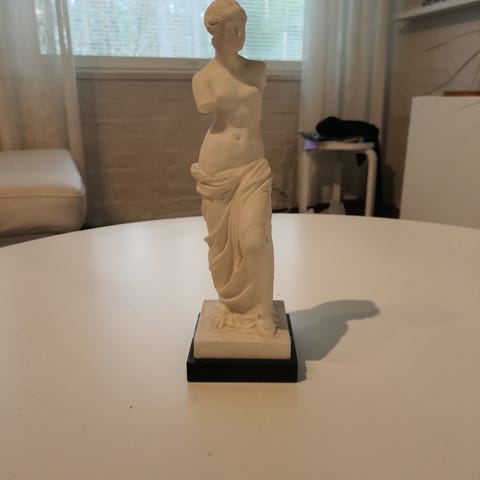 Valkoinen naistorsoaiheinen veistos koristekäyttöön. Esittää käsivartensa menettänyttä, klassista ihmishahmoa jalustalla. Materiaali vaikuttaa olevan kipsiä tai vastaavaa kovaa massaa. Sopii sisustuselementiksi esimerkiksi hyllylle, tasolle tai pöydälle. Korkeus on noin 34.5 cm