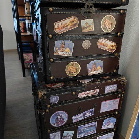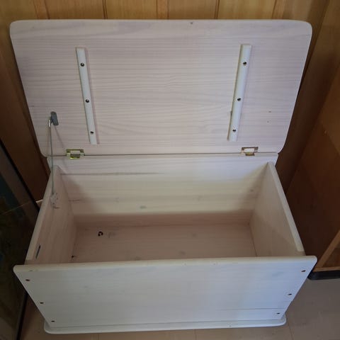 Käsityönä tehty puuarkku. Jonkin verran elämän jälkiä. Ehjä ja tukeva. Päädyssä kantokahvat.