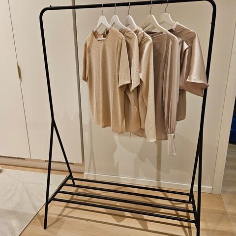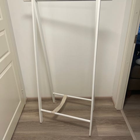 Kolmella hyllyllä varustettu ja vaatetangolla.