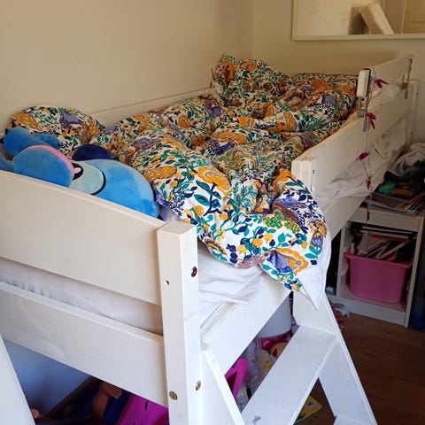 Pöydän saa työnnettyä sängyn alle