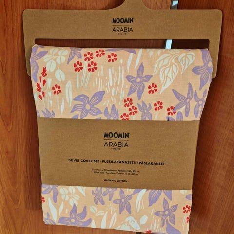 Kolmet yhden hengen muumi pussilakanat sekä lehtikuviollinen pussilakana. Ehjiä mutta hieman haalistuneita. Tyynyliinat löytyy.