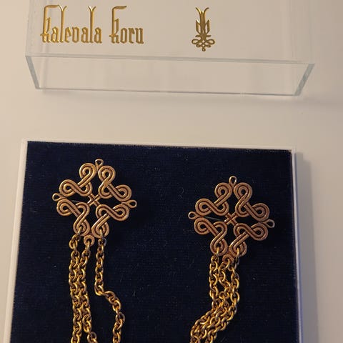 Pronssinen itse hiottu kivikaulakoru (rodoniitti?). Kalevalakorun tyylinen. Ketjun pituus 70 cm. Koko n. 3 cmx 2,5 cm.