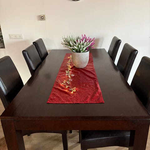 Myydään täyspuinen ruokapöytä uuden alta pois. Ei kuvan tuoleja. Paljon käytön jälkiä pöytälevyssä. Yksi jalka on liimattu kun heilui.